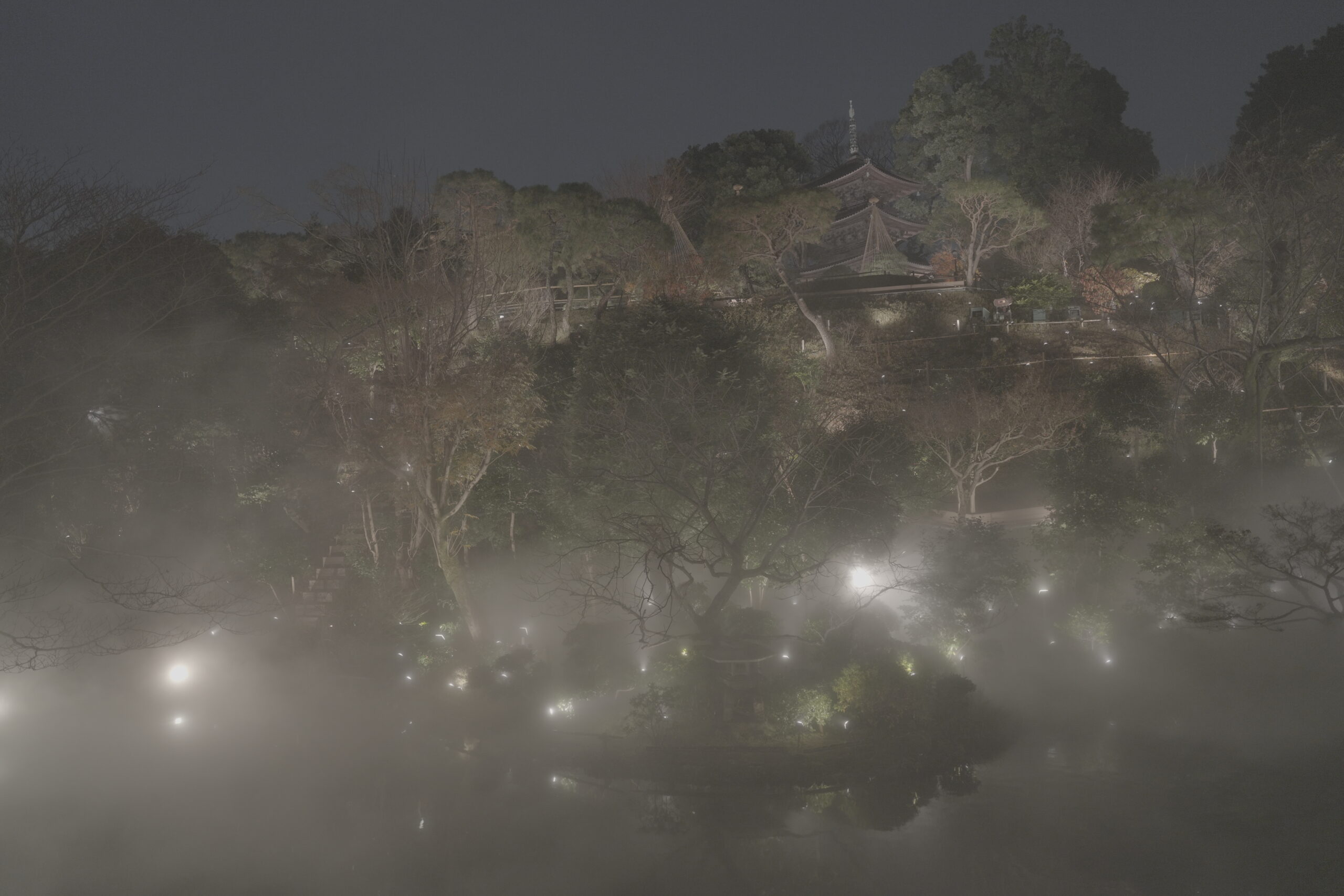 さらに近づいて見ると、三重塔と霧のコラボレーションがより一層幻想的に映ります。ライトアップされた木々が霧の中に浮かび上がる様子は、都心にいることを完全に忘れさせてくれました。何度見ても飽きない絶景です。
