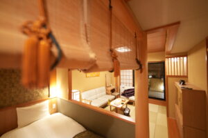 クローゼットには館内着が用意されていて、滞在中はこれに着替えてリラックス。パジャマ兼ルームウェアとして使えるので、荷物を減らせるのも嬉しいポイントだ。